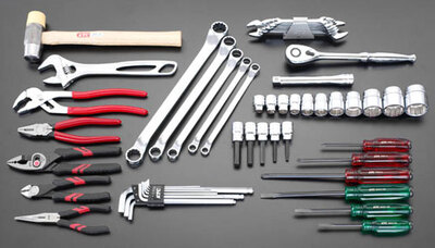 KTC [セット内容] ●(1/2”)ソケット(6P)…10・12mm ●(1/2”)ソケット(12P)…13・14・17・19・22・24・27・30・32mm ●(1/2”)ラチェットハンドル…250mm ●(1/2”)エクステンションバー…150mm ●(1/2”)六角ビットソケット…5・6・8・10・12mm ●めがねレンチ(45°ロング)…10×12・11×13・14×17・17×19・22×24mm ●スパナ…6×7・8×10・10×12・11×13・12×14・17×19mm ●樹脂柄(−)ドライバー(貫通型)…5.5×75・6×100・8×150mm ●樹脂柄(+)ドライバー(貫通型)…#1×75・#2×100・#3×150mm ●モンキーレンチ…250mm ●コンビネーションプライヤー(ソフトグリップ付)…200mm ●ラジオペンチ…165mm ●ボールポイント六角レンチ(9本組)…1.5・2・2.5・3・4・5・6・8・10mm ●コンビハンマー…610g ●ペンチ…175mm ●ニッパー…159mm ●ウォーターポンププライヤー…250mm [ケース仕様] ●ケース材質…スチール ●ケースサイズ…415(W)×220(D)×165(H)mm ●ケース付属品…仕切板:6枚 ●重量…12.5kg